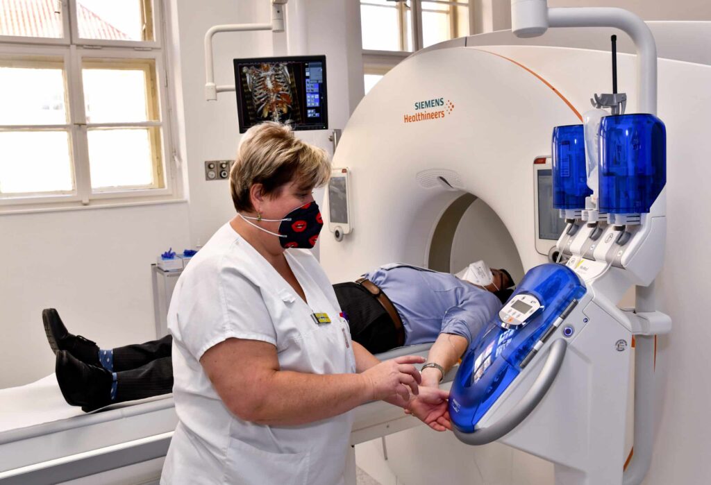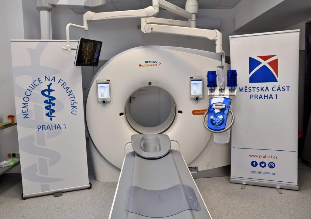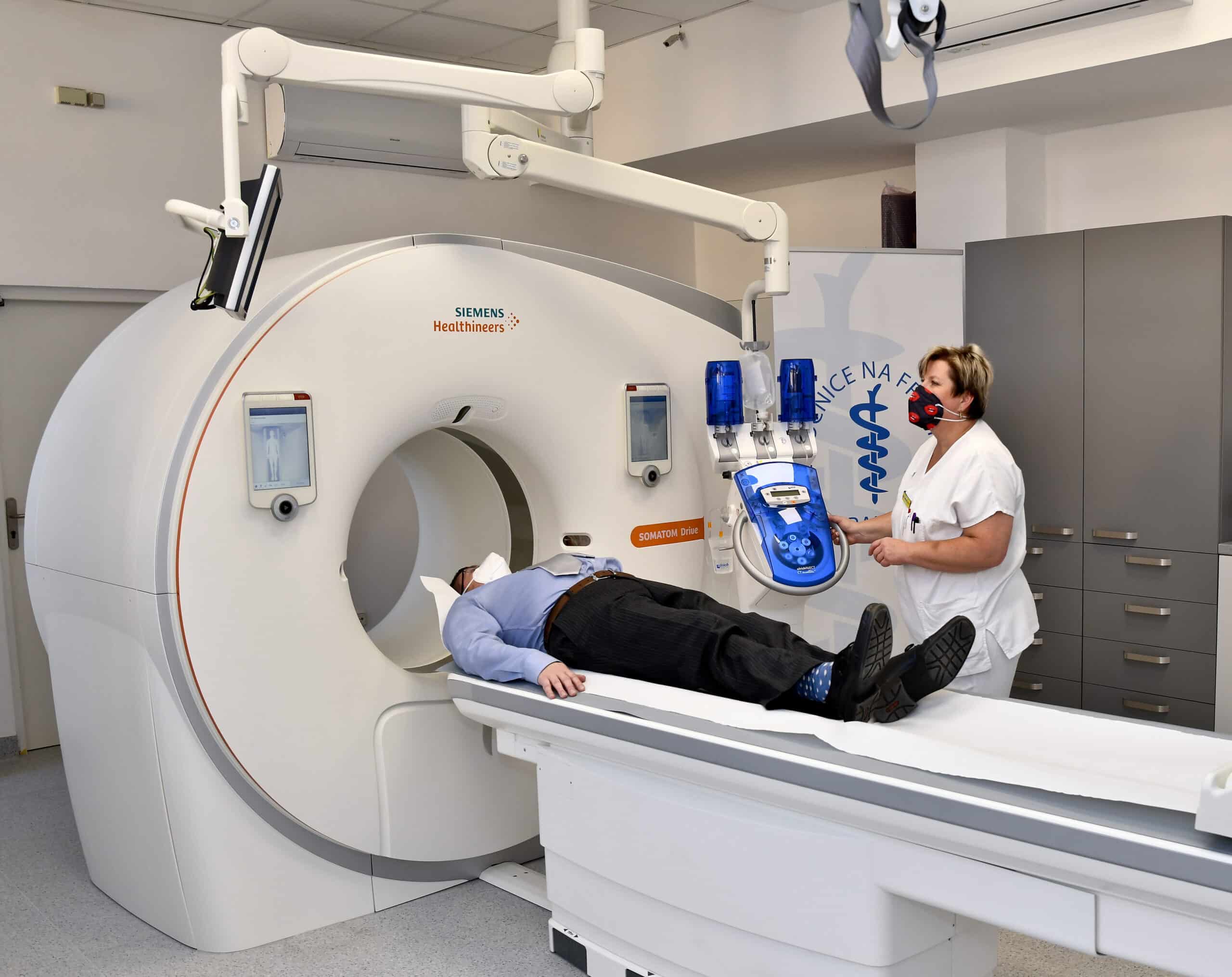 Od ledna 2022 provádíme všechna CT vyšetření na novém přístroji Siemens SOMATOM Drive se dvěma zdroji rentgenového záření. Díky vysoké rozlišovací schopnosti a dokonalým 3D rekonstrukcím umožňuje přístroj velmi přesnou diagnostiku. Pro zobrazení vnitřních orgánů a tkání využívá nižší dávky záření, a navíc není nutné pacienta zatěžovat vysokým množstvím kontrastní látky. Vyšetření probíhá rychle, takže pacient nemusí během vyšetření zadržovat dech. Přístroj také umožňuje provádět speciální vyšetření, která poskytují zcela nové diagnostické informace a pomáhají lékaři při volbě cílené léčby konkrétního pacienta.