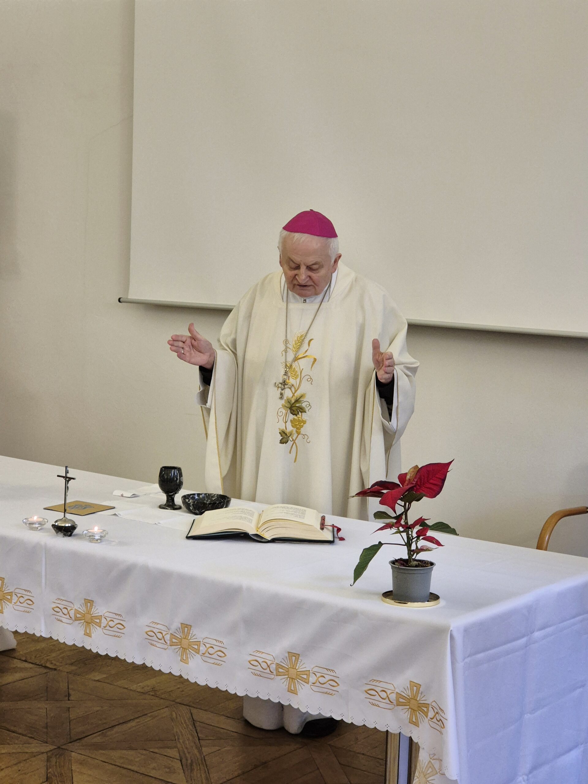 Mši celebroval Mons. Karel Herbst, emeritní pomocný biskup pražský a salesián. Ve své promluvě se věnoval mimo jiné postavě Ježíše Krista a víře v jeho věčný život. Zdůraznil, že právě v obdobích nemoci, nejistoty či osobních zkoušek mohou lidé nalézat útěchu, naději a oporu v duchovním rozměru víry i v samotném Kristu. Při bohoslužbě jej doprovodil kněz Lukáš Lipenský z Rytířského řádu Křižovníků s červenou hvězdou.